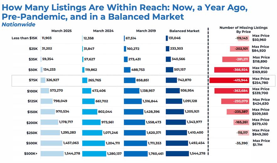 - Middle-Income Buyers: Buyers earning between $75,000 and $100,000 annually have seen the greatest improvements in the affordable housing supply when compared to all income groups. About 21% of listings are within reach for these households. But a gap still persists. Consider, in 2019, these middle-income buyers could afford nearly half of all listings, a level considered more balanced for the market. This suggests a shortage of more than 400,000 listings priced below $255,000, which would be affordable to this income group, according to the report.